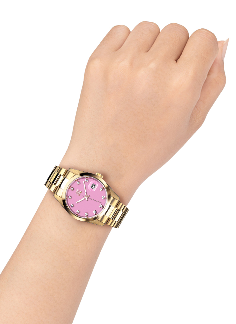 Orologio donna Movimento quarzo Miyota Cassa acciaio Cinturino acciaio Quadrante con strass Fondello acciaio a vite Vetro minerale Diametro cassa 36 mm Datario ore 15 Water resistant 5-ATM
