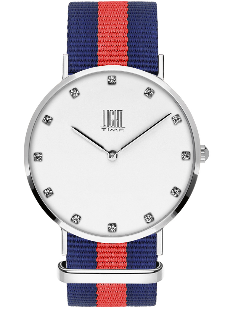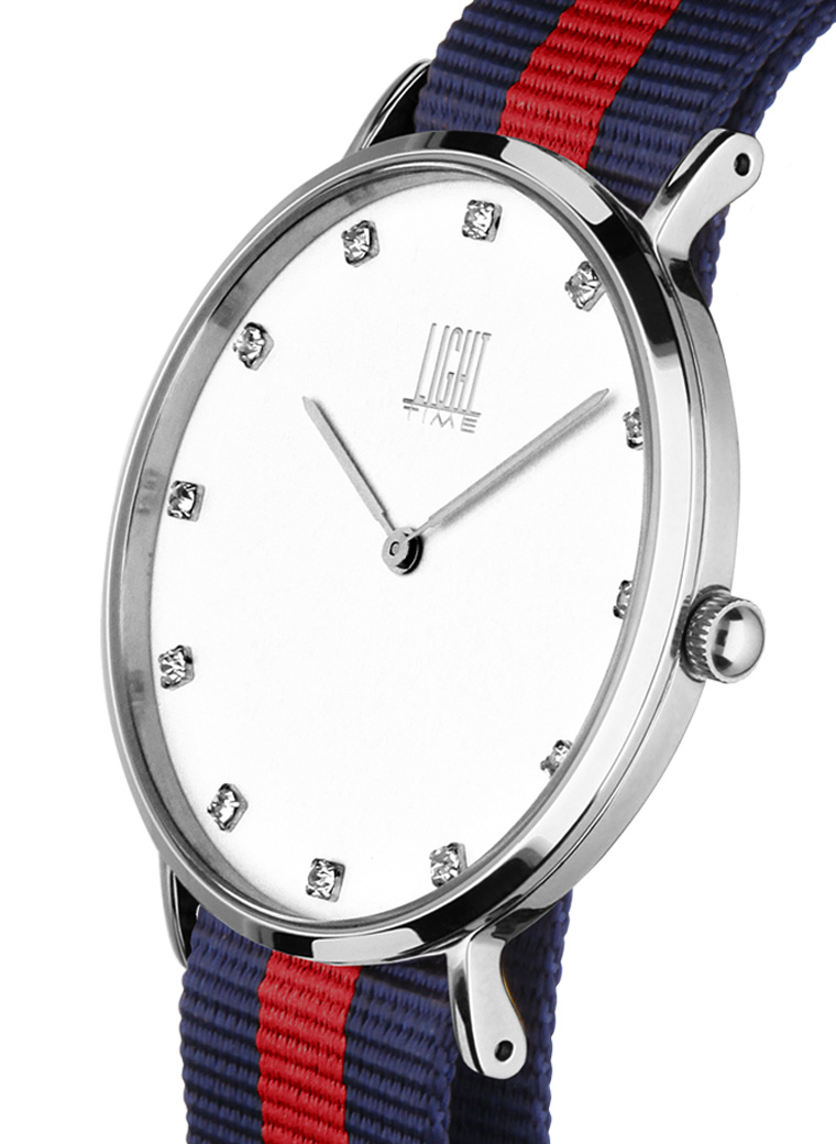 Movimento al quarzo, Cassa in acciaio in tre pezzi, Fondello in acciaio, Quadrante con strass, Vetro minerale, Diametro cassa 40 mm. Cinturino passante in nylon.