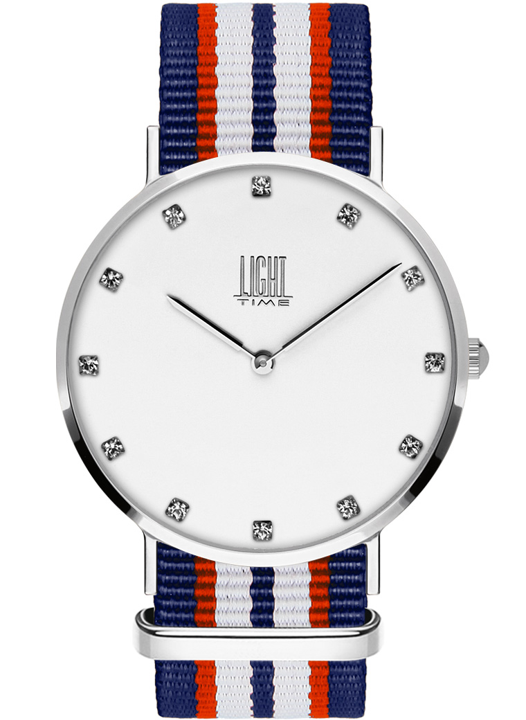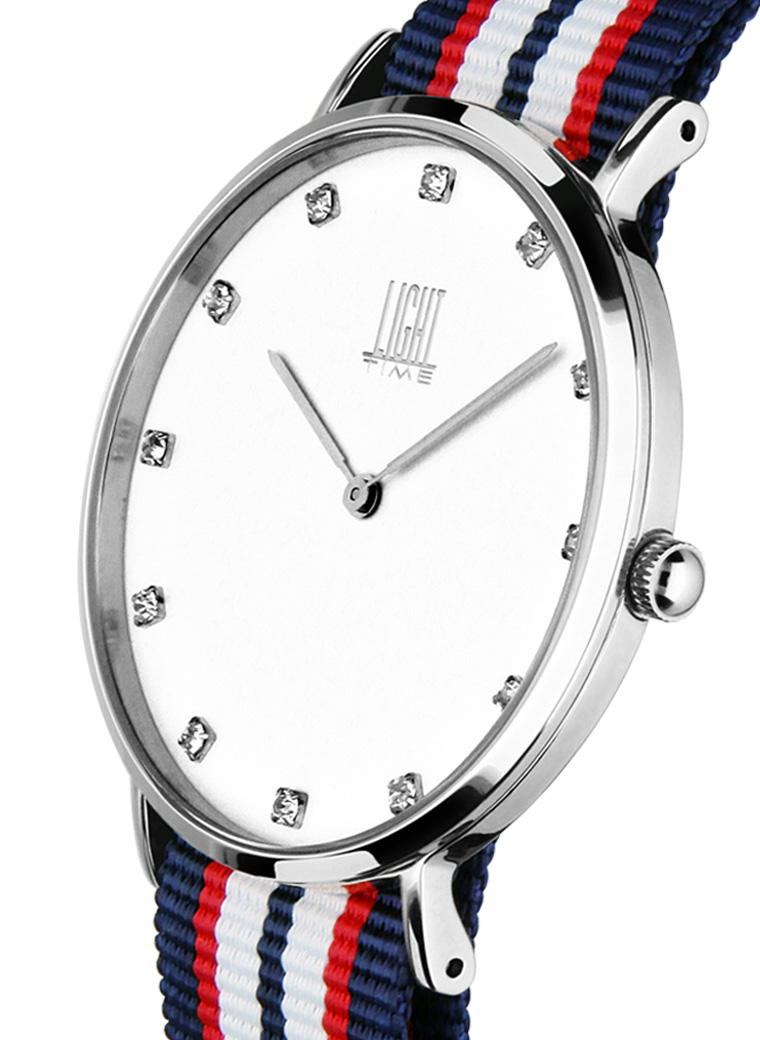 Movimento al quarzo, Cassa in acciaio in tre pezzi, Fondello in acciaio, Quadrante con strass, Vetro minerale, Diametro cassa 40 mm. Cinturino passante in nylon.