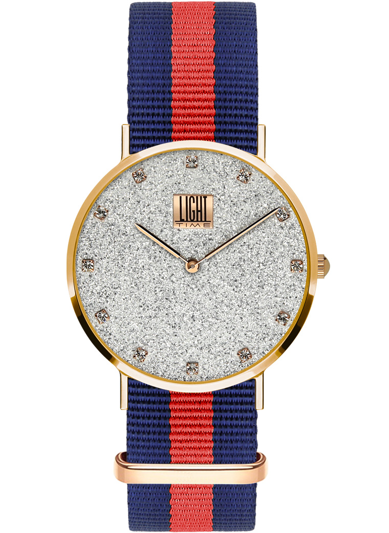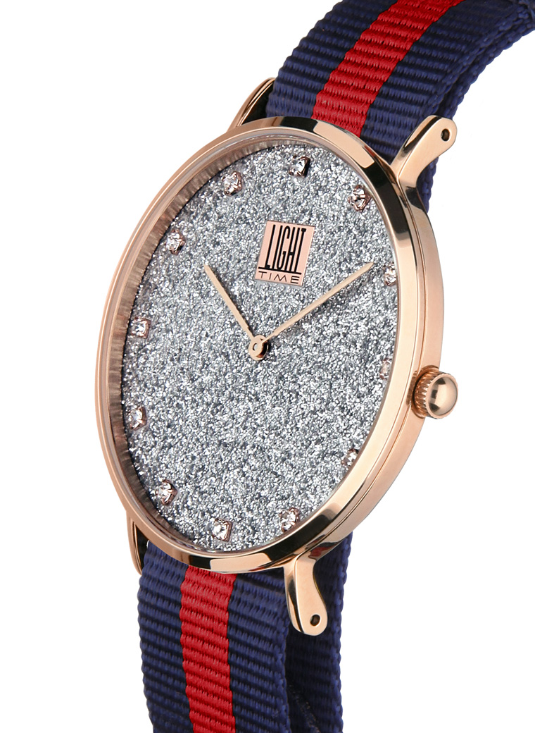 Movimento al quarzo, Cassa in acciaio IP rosè in tre pezzi, Fondello in acciaio, Quadrante pavè con strass, Vetro minerale, Diametro cassa 36 mm. Cinturino passante in nylon.