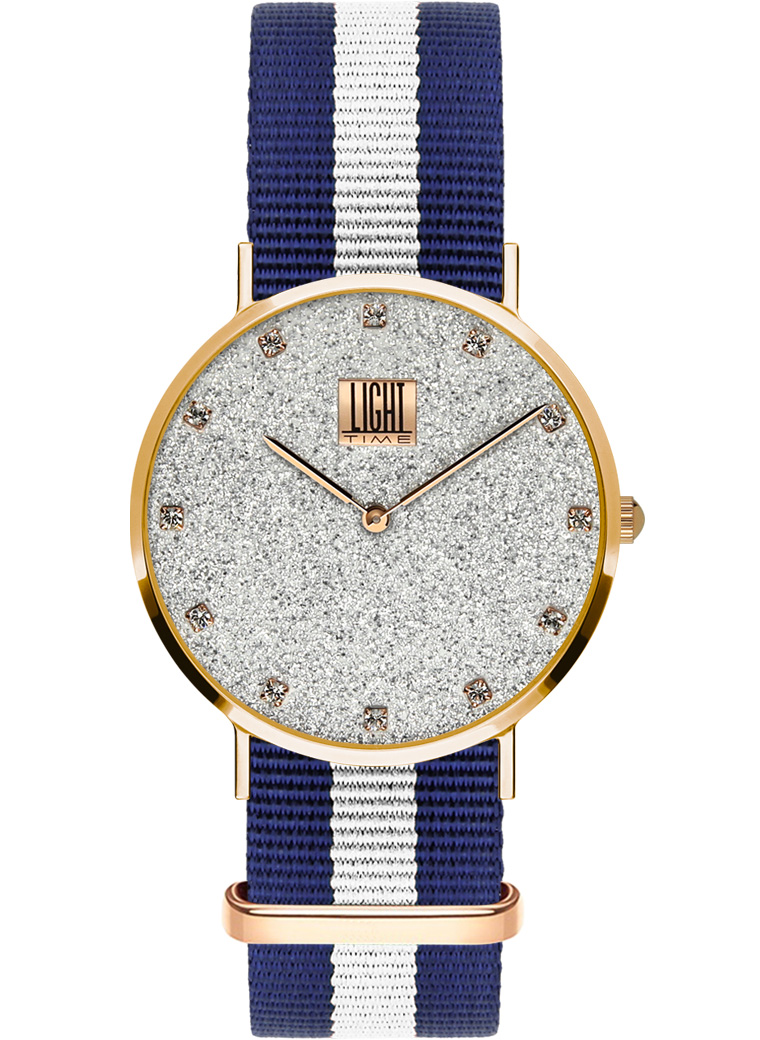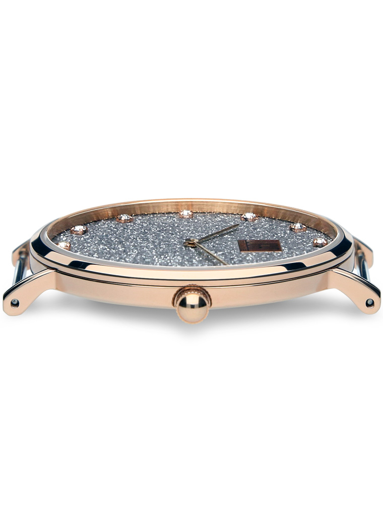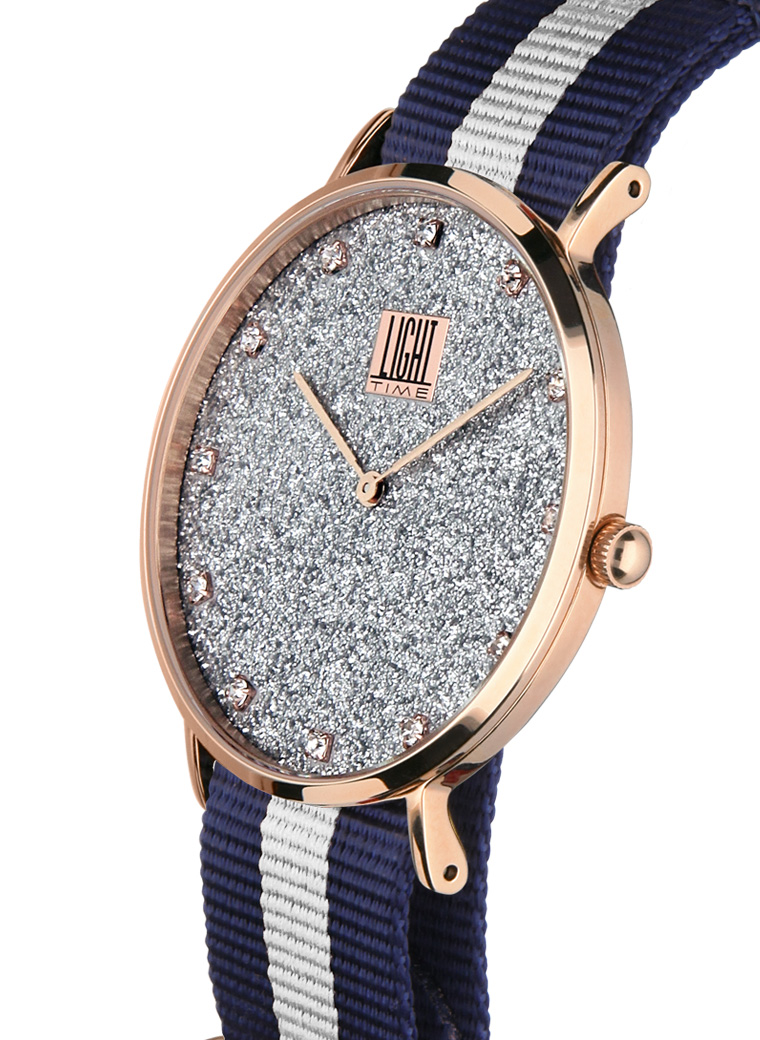 Movimento al quarzo, Cassa in acciaio IP rosè in tre pezzi, Fondello in acciaio, Quadrante pavè con strass, Vetro minerale, Diametro cassa 36 mm. Cinturino passante in nylon.