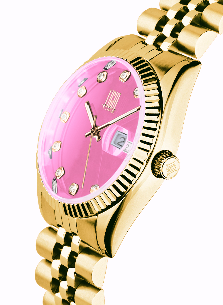 OROLOGIO DONNA AL QUARZO COLORE ORO CASSA E BRACCIALE ACCIAIO SOLIDO FONDELLO E CORONA A VITE QUADRANTE ROSA DATARIO ORE 3 DIAMETRO 36 mm WATER RESISTANT 5ATM