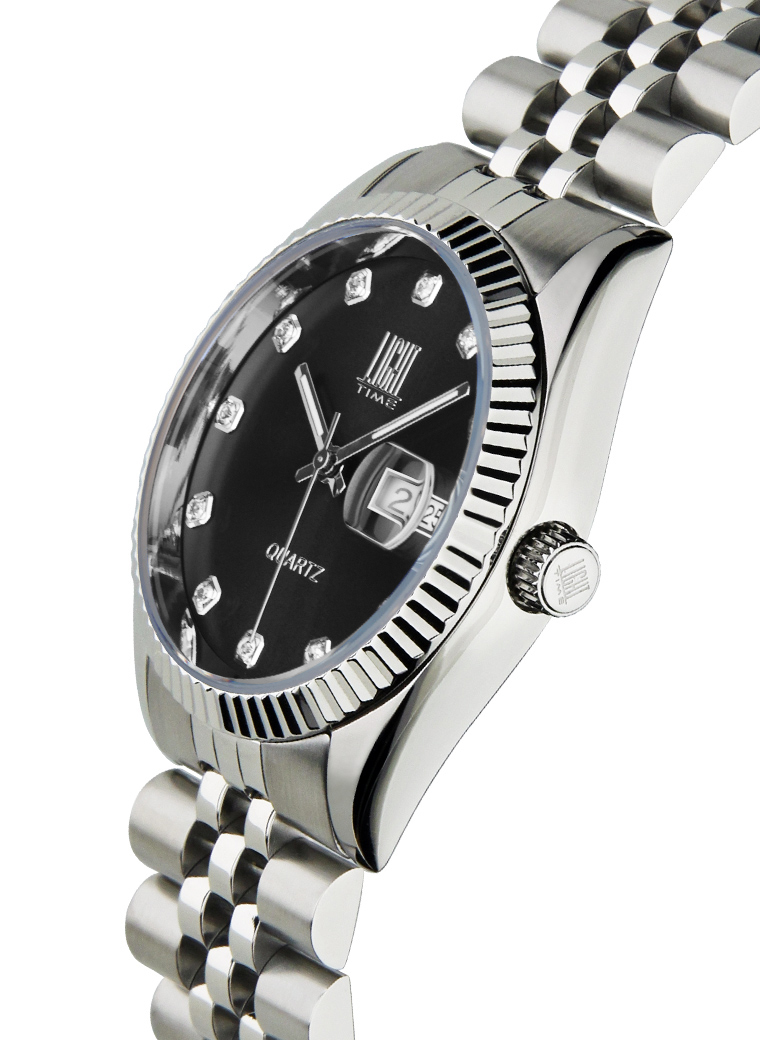 OROLOGIO DONNA AL QUARZO CASSA E BRACCIALE ACCIAIO SOLIDO FONDELLO E CORONA A VITE QUADRANTE NERO CON STRASS DATARIO ORE 15,00 DIAMETRO 36 mm WATER RESISTANT 5ATM