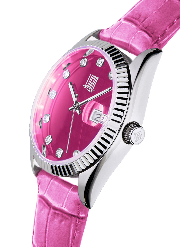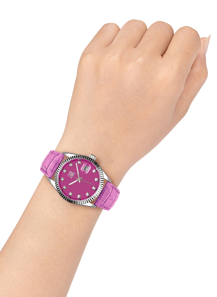 OROLOGIO DONNA AL QUARZO CASSA ACCIAIO SOLIDO CINTURINO IN PELLE FONDELLO E CORONA A VITE QUADRANTE FUCSIA DATARIO ORE 15,00 DIAMETRO    36 mm WATER RESISTANT  5ATM