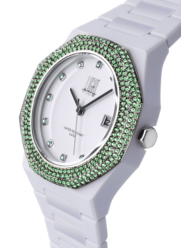 Orologio donna con movimento al quarzo miyota, Cassa in policarbonato, Diametro mm. 40 Ghiera acciaio con strass Quadrante bianco con data a ore 3 Vetro minerale con lente Bracciale in policarbonato Fibbia acciaio a scomparsa Water resistant 5ATM Su richiesta, possiamo regolare la dimensione bracciale in base alla misura del tuo polso. Durante l’ordine potrai fornire la circonferenza del tuo polso in centimetri ed inserirlo nel campo note.